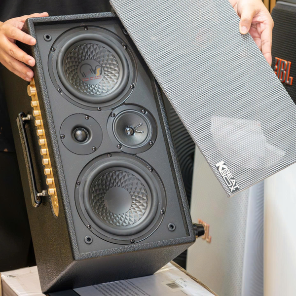 Thiết kế: Dạng hình hộp chữ nhật, thùng loa làm bằng gỗ chắc chắn và được bọc da PU cao cấp (Simili) màu đen, mang lại vẻ ngoài sang trọng và bền bỉ.