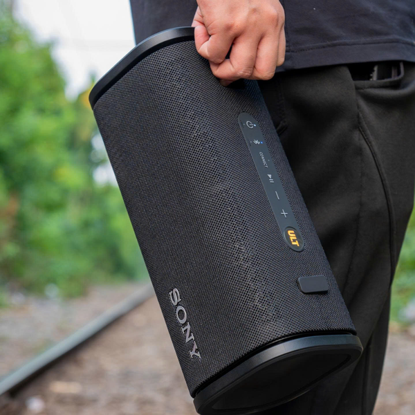 Cảm giác cầm nắm: Loa nặng khoảng 3.3kg, khá đầm tay. Sony đã thay đổi từ tay cầm cứng sang dây đeo vải có thể tháo rời, giúp bạn đeo vai như một chiếc túi xách, cực tiện khi đi dã ngoại.