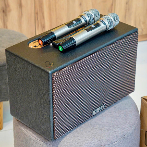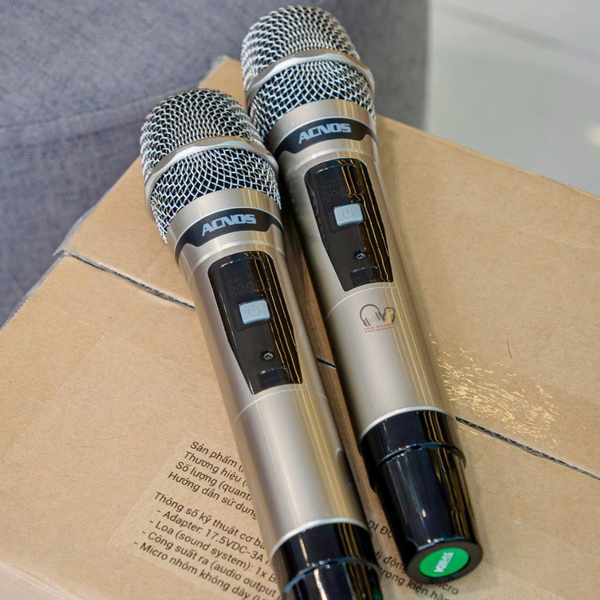 Micro đi kèm: Bộ 2 micro không dây UHF bằng nhôm, cầm rất đầm tay. Micro hút âm tốt, nhẹ hơi, giúp người hát không bị mệt.