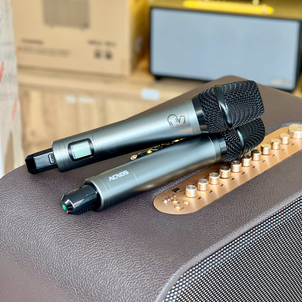 Micro UHF cao cấp: Đi kèm bộ mic vỏ nhôm sang trọng, bắt âm nhạy và có thể tùy chỉnh dải tần qua App.