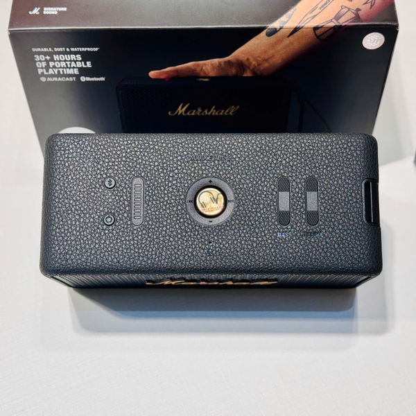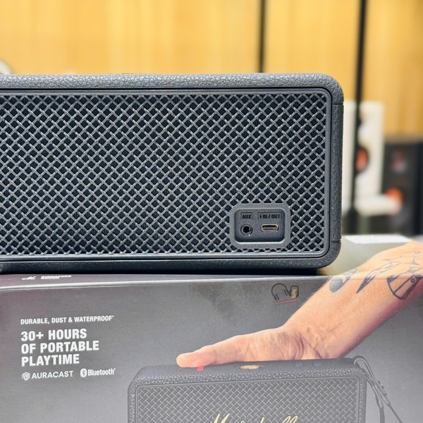 Phong cách Marshall: Vẫn giữ nguyên thiết kế hình hộp hoài cổ, lấy cảm hứng từ ampli guitar kinh điển của Marshall, với lưới tản nhiệt kim loại và logo Marshall nổi bật.