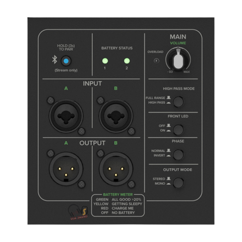 Chạy bằng Pin (Battery-Powered): Điểm khác biệt lớn nhất. Loa sử dụng pin Lithium-Ion GB-200 và có hai ngăn chứa pin hot-swappable (thay nóng).